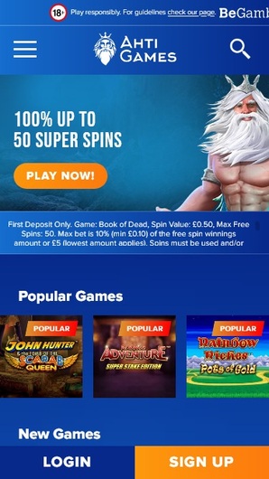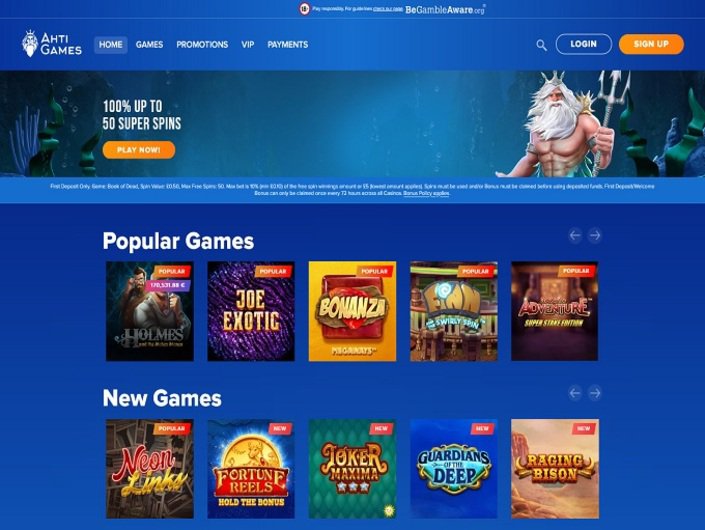 The casino’s name, Ahti, is inspired by a Finnish hero from the Kalevala epic. The website layout reflects an oceanic theme, with a user-friendly interface and multiple language options.