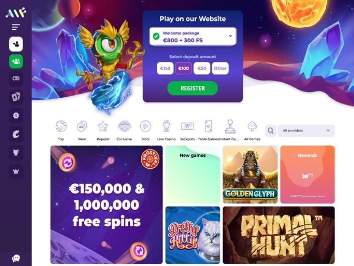 Upon entering the site, players are greeted by alien heroes in an imaginary world called Alf. The layout is user-friendly, with important information on the left side and a menu button for easy navigation. The gaming library is showcased in the center, with detailed avatars and a footer containing essential casino information.
