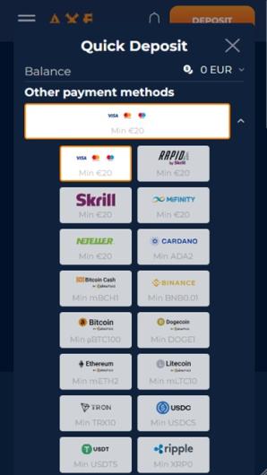 AxeCasino offers a decent selection of payment methods to facilitate hassle-free deposits and withdrawals for customers from different parts of the world. The website accepts a wide range of FIAT currencies while fans of digital assets are welcome to reap the full benefits of crypto gaming. Below are a few key points to keep in mind for a smooth player experience.