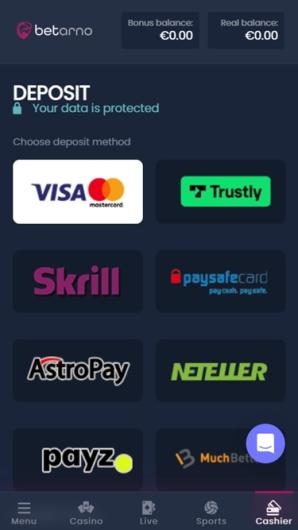 Betarno accepts multiple fiat currencies and payment methods but does not support cryptocurrencies. There are specific terms and conditions for withdrawals, including cashout limits and inactive account fees.