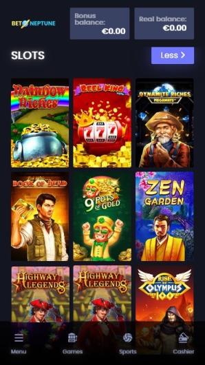 BetNeptune offers a wide range of sports betting options including live betting and pre-match bets. The casino section features popular slots, table games, live casino games, and jackpots.
