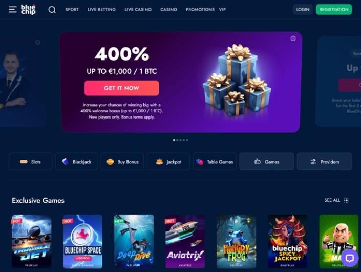 Blue Chip unites three major categories in gambling: sport (live betting), live dealers and casino. Each customer is welcome to spin the reels and place their bets for both fiat and crypto, no limitations involved. There are also plenty of tournaments taking place onsite, and those who want to get their lucky tickets for lotteries are received with open arms too.