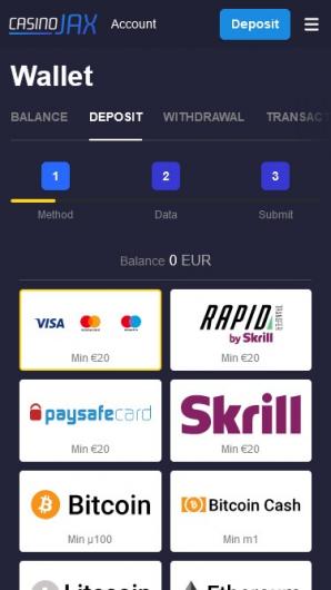 As for the deposit options, many casinos nowadays offer as many compelling payment methods as possible, so CasinoJAX is no different. So you will have the opportunity to deposit with many banking methods, including debit and credit cards, prepaid vouchers, e-wallets, numerous cryptocurrencies, and others. Note that the availability of these payment methods depends on the country you log in.