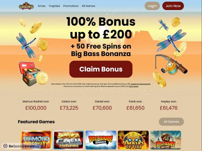 Cozino is a Wild West-themed addition to the prolific Jumpman Gaming network of online casinos and bingo halls. Designed as a spacious yet cozy saloon located in some prairie town, it serves the best slots and, of course, has enough room for live dealer tables. Just like every self-respecting saloon in the Old West, this popular place values its regulars and gladly welcomes new patrons, offering tons of promotions and a hearty sign-up package. Gamblers of all styles can take advantage of Happy Hours, Trophy Mega Reels, and many other rewarding events to grab hefty bunches of bonus spins or win an Amazon or Just Eat voucher. To make playing even more entertaining, the website uses the Trophies system, which is well-familiar to all punters who have ever had an account with gaming platforms that belong to the Jumpman stable. Completing fun tasks will unlock trophies and bring an extra spin on the Mega Reel while five unlocked trophies mean leveling up and getting access to better bonuses.
