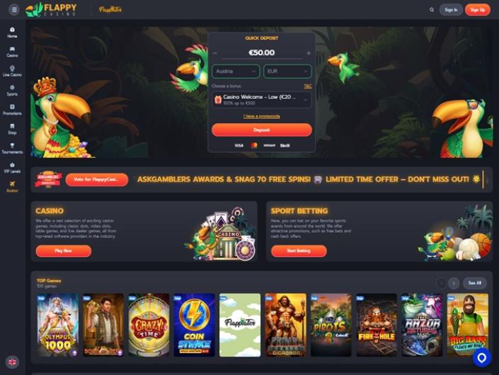 Flappy Casino offers a diverse gaming library powered by top developers, including slots, table games, live casino games, and sports betting options.