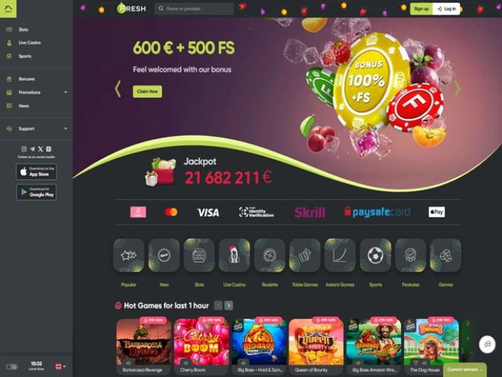 Fresh Casino is rated 22 of 1633 casinos reviewed with a score of 4.1 out of 5 after 127 votes and it has 5734 Slots offered from 1x2gaming, Amatic Industries, Ash Gaming and 123 others with an average rating of 3.6 out of 5 after 148592 votes.