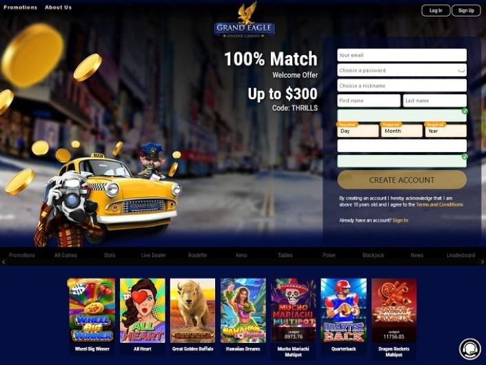 Grand Eagle Casino is an online casino that welcomes US players with eagle symbolism and New York-themed design. Canadian players are also allowed at this casino, offering games by BetSoft, Rival, and Saucify. The casino ensures safe and reliable playing experience through state-of-the-art technology, regular tests by iTech Labs, and security protocols.
