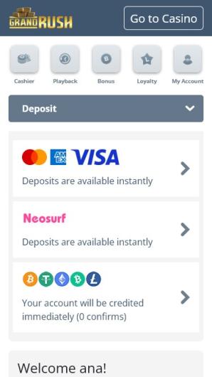 Tip: Withdrawal requests will be processed daily within Grand Rush Casino. However, payments to player accounts will only take place Monday and Thursday.
