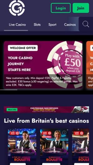 Live casino games at Grosvenor Casino include Baccarat, Roulette, Blackjack, and more.