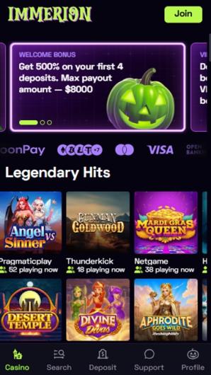 Immerion Casino boasts quite an impressive gaming library counting over 6000 games powered by some of the well – regarded iGaming industry software developers. The casino offers a wide range of slots, table games, live casino options, jackpot games, and more.