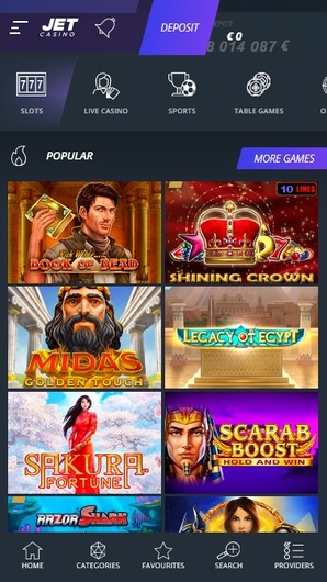 Jet Casino offers a wide range of popular games from top developers like Pragmatic Play, Microgaming, and NetEnt. The selection includes slots, table games, and live casino options.
