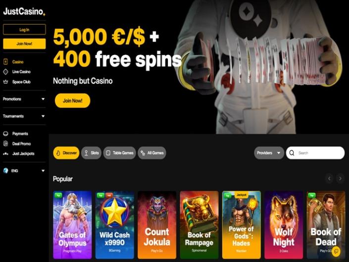 JustCasino was established in 2023 with a view to take the online gaming community to another dimension of fun and excitement. Prepare yourself for a journey through the cosmos with an out of this world portfolio of some 9500+ games, loyalty perks, cashback bonuses, tournaments and around the clock customer support!