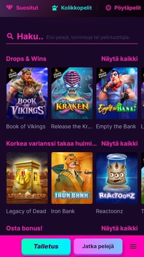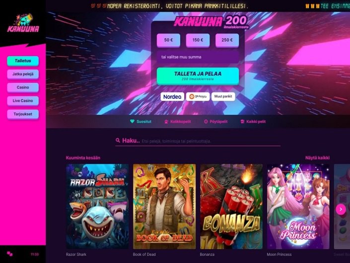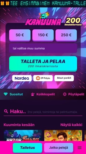 Kanuuna Casino accepts Zimpler and Nordea for banking transactions. Players may need to undergo verification procedures for cumulative sums over EUR2000.