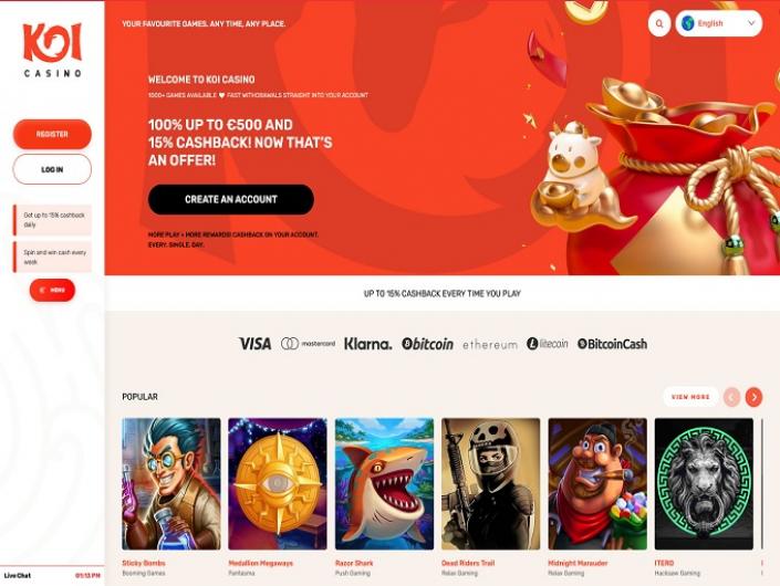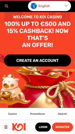 By the look at its logo, Koi Casino seems to be themed around koi fish, adding to its attractive orange and white design. The website offers multiple language preferences for user convenience.
