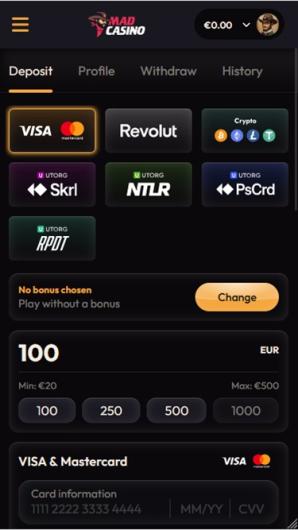 Mad Casino provides a wide range of gaming options, including a dedicated sports betting section. The platform offers traditional and niche sports for betting, as well as virtual sports options.