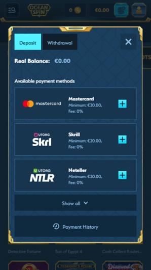 OceanSpin supports both fiat and cryptocurrencies for transactions, including popular options like Bitcoin, Tether, and Dogecoin. The casino ensures swift and secure transactions with various payment methods.