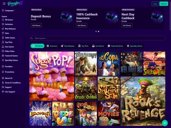 Paradise 8 Casino offers players over 300 diverse games to choose from. Besides Rival titles, here you can also find numerous releases of the top developers like Betsoft, Tom Horn, Saucify, and Spinomenal.