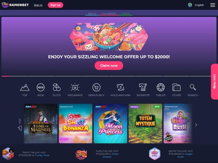 RamenBet offers over 10,000 games from 44 providers, including slots, table games, jackpots, crash games, and live dealer games. Sports betting is also available with over 40 different sports.