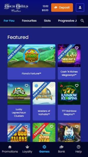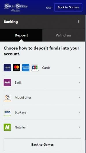 Rich Reels offers a wide selection of games including slots, blackjack, roulette, table games, video poker, and live casino options. The casino also features progressive jackpot games.