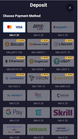 To comply with AML regulations, you are allowed to withdraw using the same payment method you used to deposit. If, for example, you made a Visa deposit, you will be able to withdraw winnings to your bank account related to your visa card.