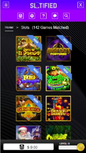 The mobile version of Slotified Casino offers a smooth experience with a compact design. Its dark theme and vibrant accents provide a visually appealing interface, with purples and blues making key elements stand out. Important information such as bonuses, games, and banking options is easily accessible with a swipe, maintaining a cohesive flow.