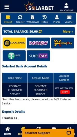 Only deposits via Online Bank Transfer or PayNow are accepted at Solarbet. It is important to follow the guidelines provided to ensure smooth transactions and timely processing of withdrawals.