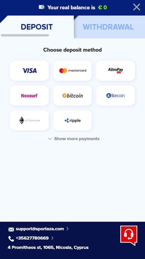 Sportaza offers various payment methods including fiat currencies, e-wallets, and cryptocurrencies for deposits and withdrawals. Players should review the terms and conditions before making any financial transactions.