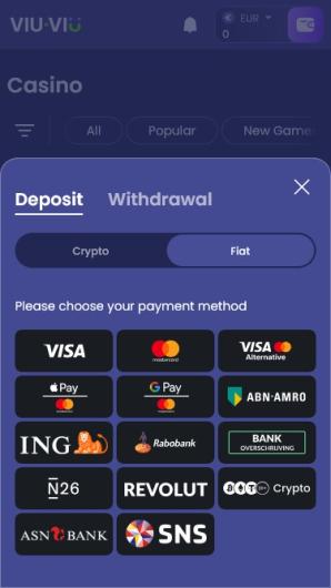 Viu Viu Casino offers a decent selection of both traditional and crypto payment methods. Naturally, the availability of cryptocurrencies makes depositing funds and withdrawing winnings much easier. Here are some key points to keep in mind in addition to the banking info featured on the right side of this page: