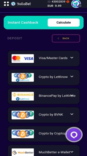 Minimum deposit amounts at YallaBet vary depending on the payment method used. Cryptocurrency deposits must be equal to or above €10. The casino does not charge deposit fees but individual payment methods may.